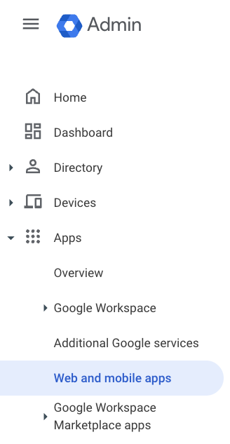 Starting from https://admin.google.com select Apps > Web and mobile apps.