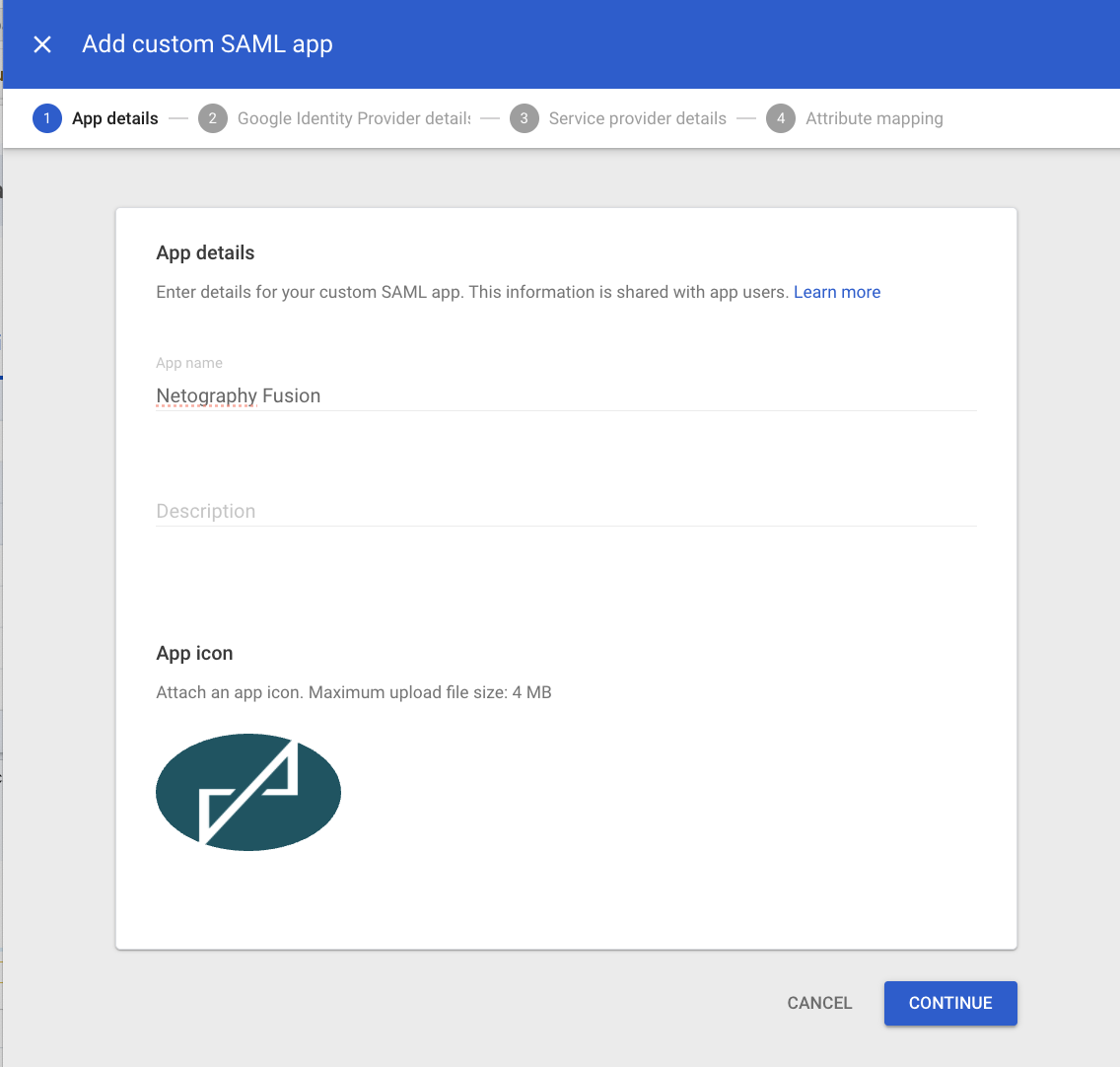 Once the metadata file has been uploaded, go back to GSuite, click "Continue", then perform the following: