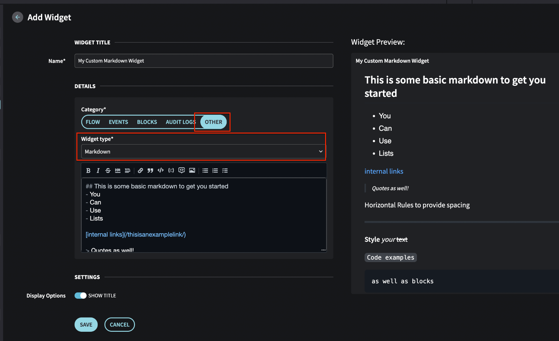 When adding a widget, the category OTHER option now includes a Markdown option in the Widget type drop down and includes a prefilled markdown template to get you started.