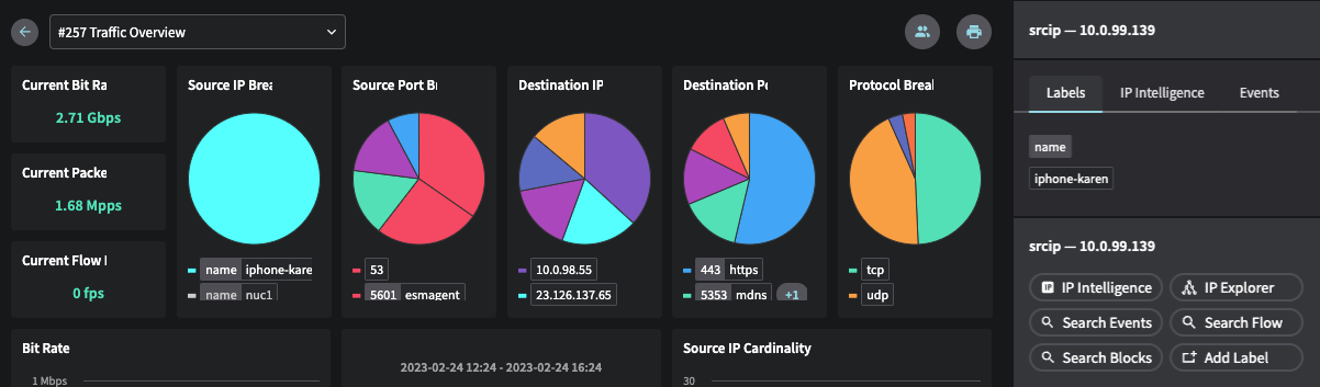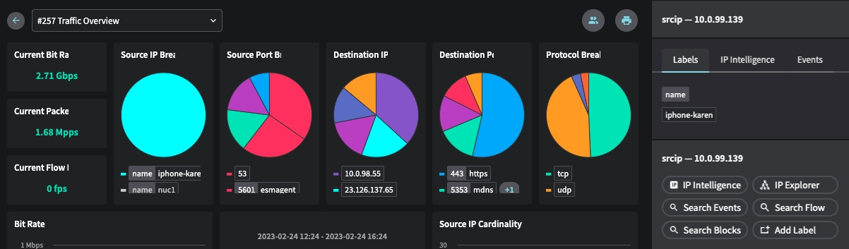 The right-hand “Labels Tray” has now become a “Properties Tray” with one-click access to context menus, all labels, ip intel and events. There are also clickable labels in the chart legends, which open the properties tray for further drill-down and investigation options.