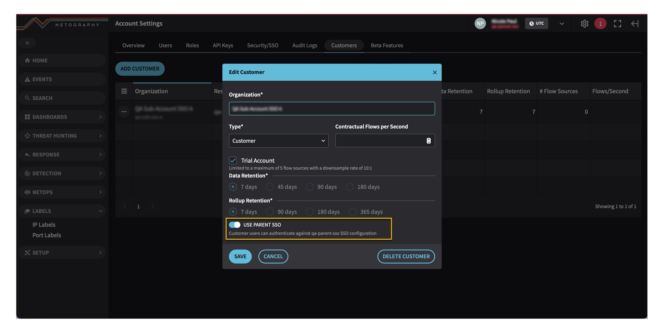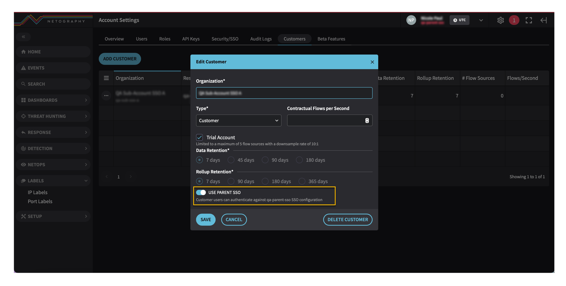 In the Account Settings, Edit Customer form, the "Use Parent SSO" toggle displays, allowing the use of parent SSO for sub-accounts.