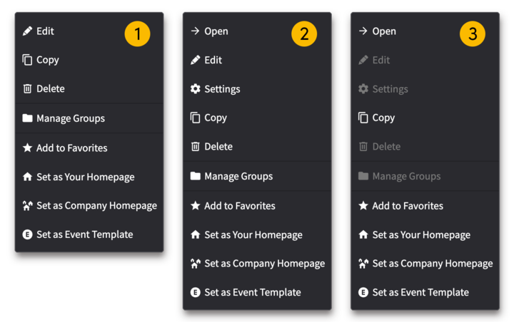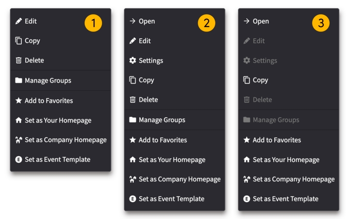 Image displays 2 additional menu options: Open and Settings. Including these new options ensures dashboards are not inadvertently modified.
